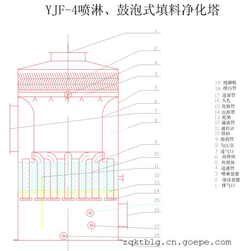 鼓泡式填料凈化塔采用NaOH溶液作為吸收中和液。廢氣由風(fēng)機(jī)壓入凈化塔中,內(nèi)筒形成壓力室,再由壓力室均配給各根鼓泡管,廢氣通過鼓泡管進(jìn)入貯液箱的吸收中和液中產(chǎn)生鼓泡,然后氣泡通過填料層,使氣液再次得到充分接觸后,經(jīng)除沫裝置除霧,然后排入大氣